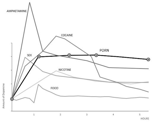 Notice on the chart that nothing compares to porn in sustaining a high near its peak. This allows people to binge for hours at a time. Most porn sessions last minutes, but hours-long binge sessions are not uncommon. Users get a fresh hit of dopamine as they anticipate new and different sex scenes.